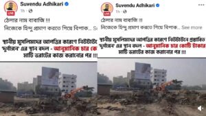 এখানেই শেষ নয়। নন্দীগ্রাম বিধায়ক আরও লেখেন, “অজ্ঞতা ভোট ব্যাংকের ওজনের ভারের তুলনায় হিন্দুদের ভাবাবেগ হালকা, তাই তাড়াতাড়ি স্থান পরিবর্তন করে বর্তমানে দুর্গাঙ্গনের স্থান নির্ধারণ করা হয়েছে নিউটাউনের বাস স্ট্যান্ডের পাশে। এবারের চিহ্নিত জমি শিল্পের জন্যে নির্ধারিত ছিল !