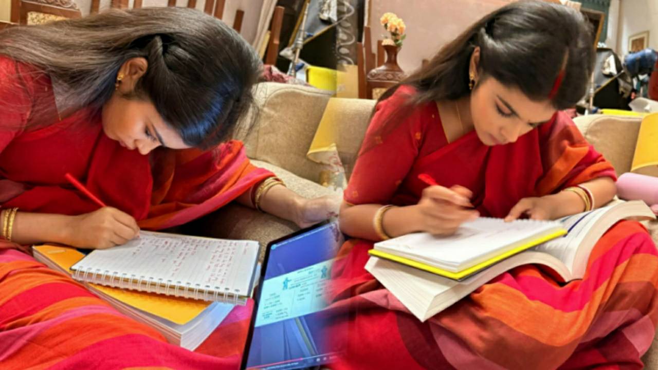 সেটেও চলছে পড়াশোনা: সোশ্যাল মিডিয়ায় কিছু ছবি শেয়ার করেছেন সাইনা। সেখানে দেখা যাচ্ছে, বই খাতা আর ট্যাব নিয়ে পড়াশোনায় ব্যস্ত তিনি। লাজবন্তীর সাজে শুটিং সেটে বসেই পড়াশোনা করতে দেখা যাচ্ছে তাঁকে। ক্যাপশনে সাইনা (Saina Chatterjee) লিখেছেন, ‘লাজবন্তী চরিত্রে অভিনয়ের সঙ্গে সঙ্গে পরীক্ষার জন্য পড়াশোনা করছি। আমাদের জীবন সমান্তরালে চলছে। যেমন একই সঙ্গে খবরের কাগজে নাম উঠছে আর এখন পরীক্ষার জ্বর চেপেছে’।